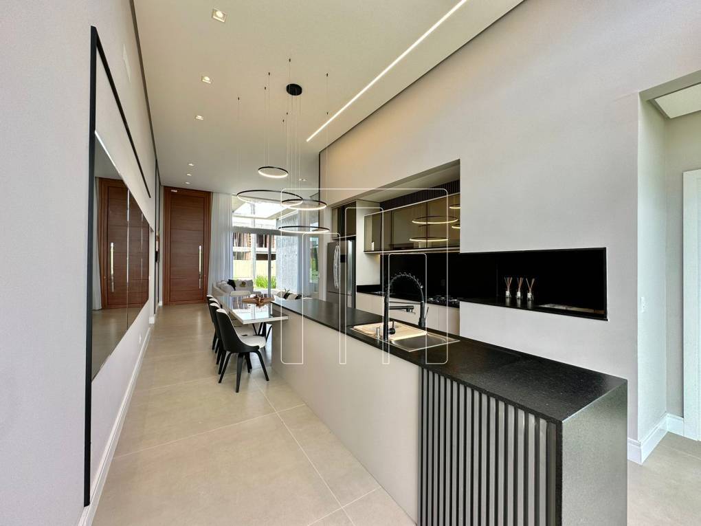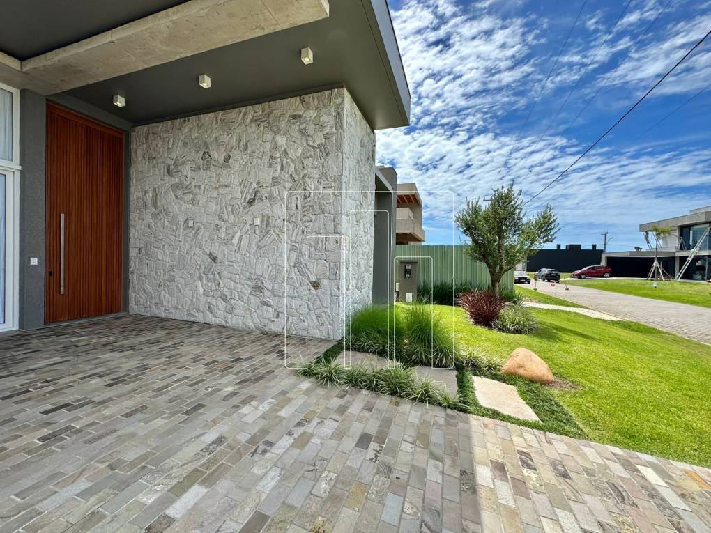 Condomínio junto ao mar! Casa com 187, 27 M², distribuídos em 04 Suítes, lavabo, finamente mobiliada e decorada, ampla sala de estar com mais de 60m², lareira revestida em porcelanato, aberturas em PVC com automação, porta de entrada ripada, 4 metros de altura, incrível paisagismo com irrigação, espera para carregador automotivo, fachada com revestida pedras naturais.